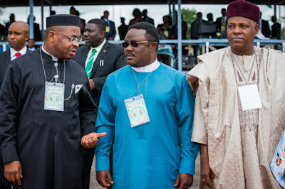 President Buhari was hosted to a state dinner by Cameroonian President, Paul Biya and his wife Mrs Chantal Biya at the Unity Palace in Yaounde yesterday. Pictured on the high table with Buhari and Biya are the Governors of Cross River state, Ben Ayade & Borno state Alhaji Kashim Shettima.